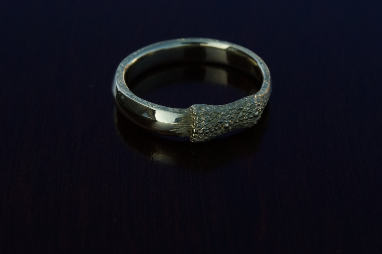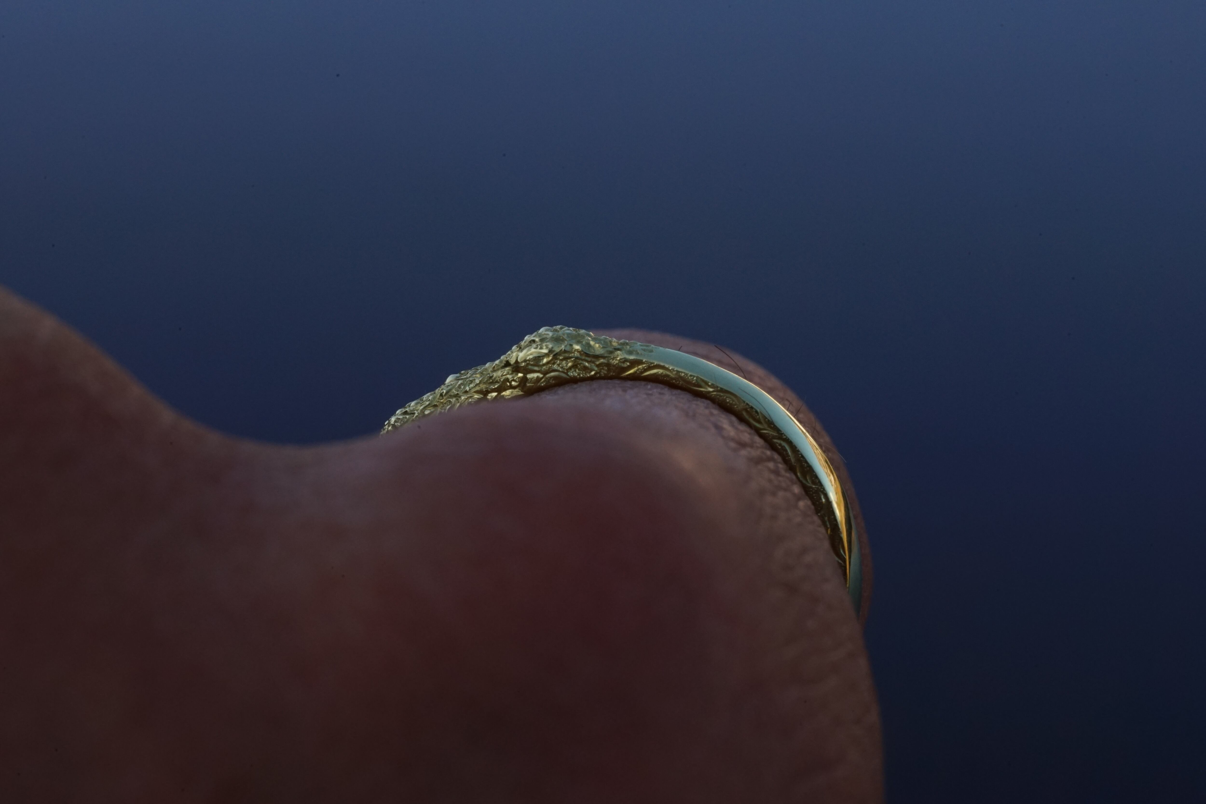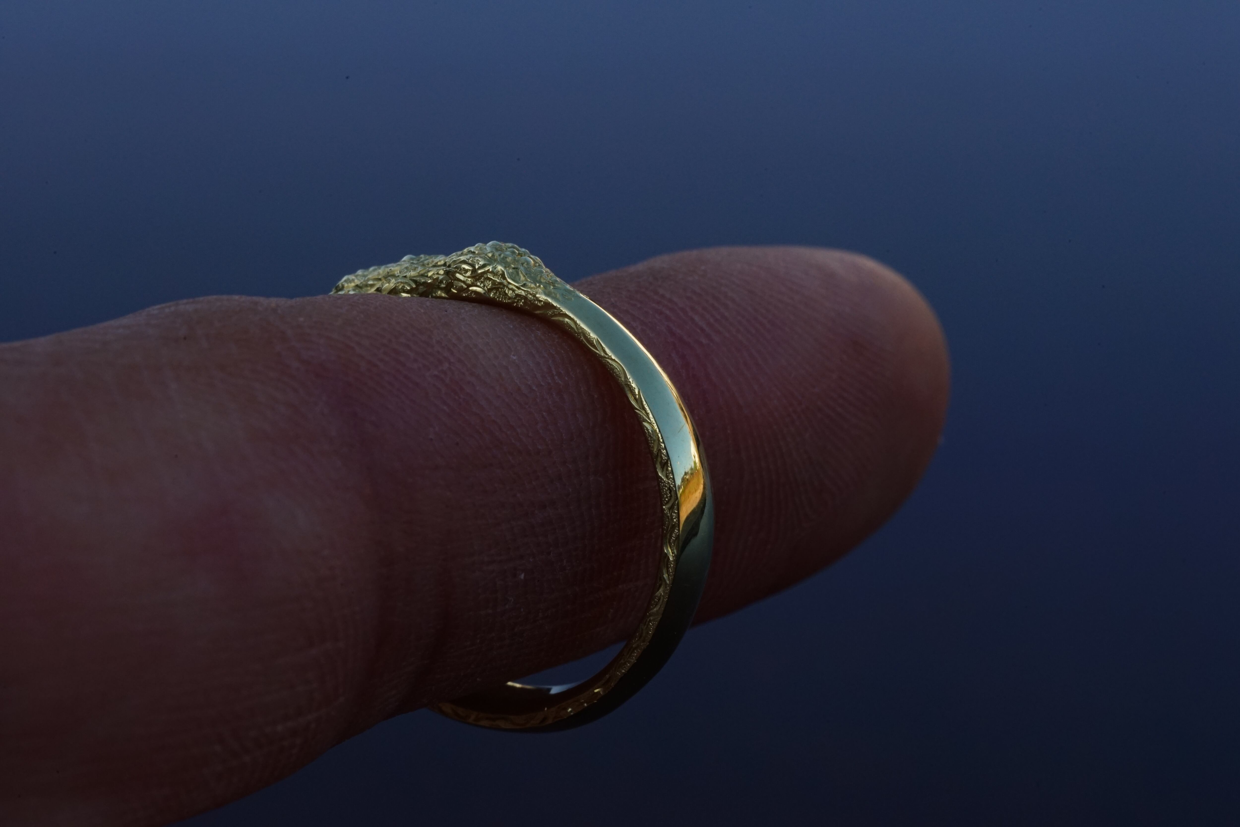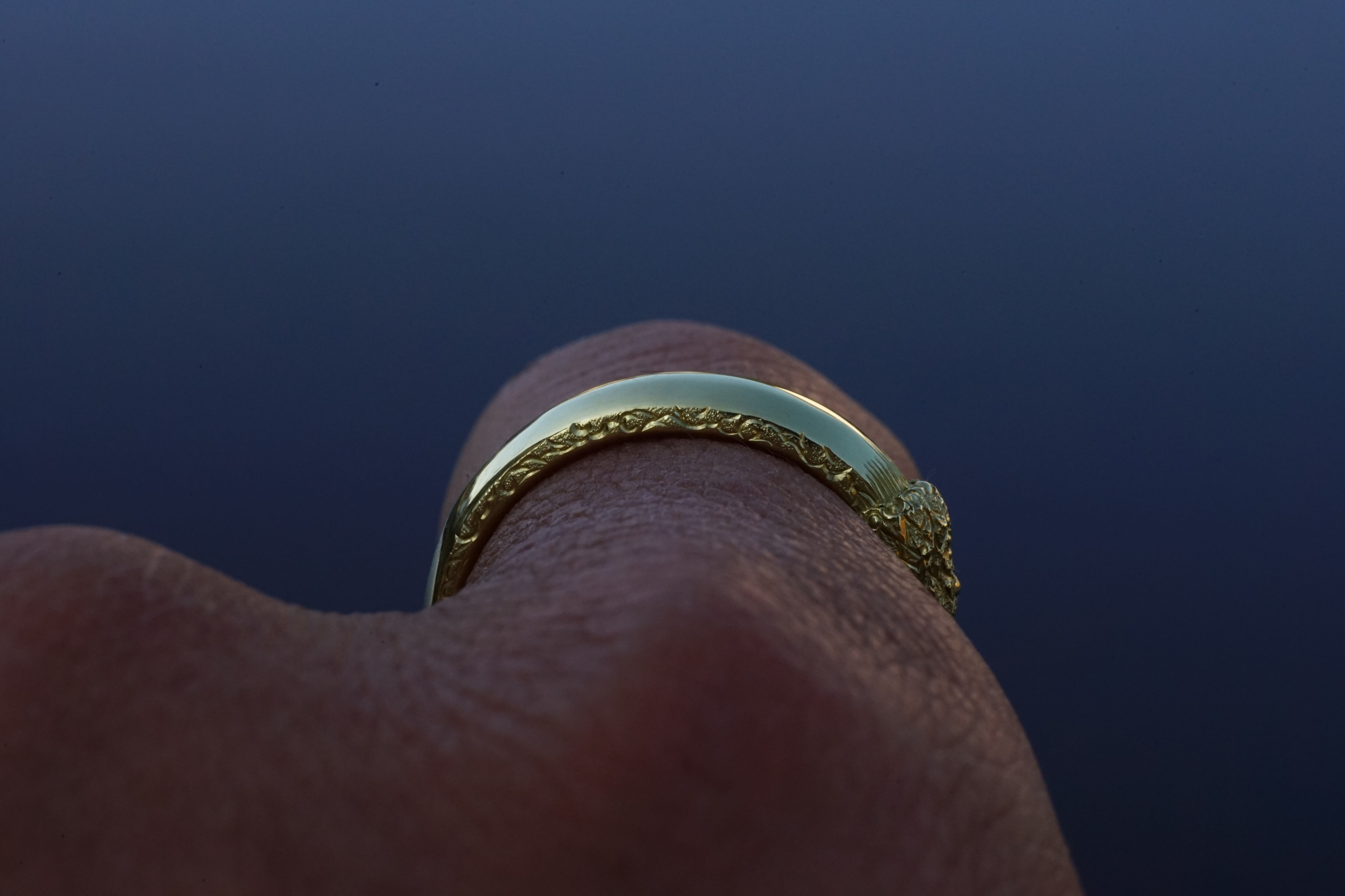 Aki Tanakaによる一本爪リングに三村紀人氏が彫刻を施した共同創作品。