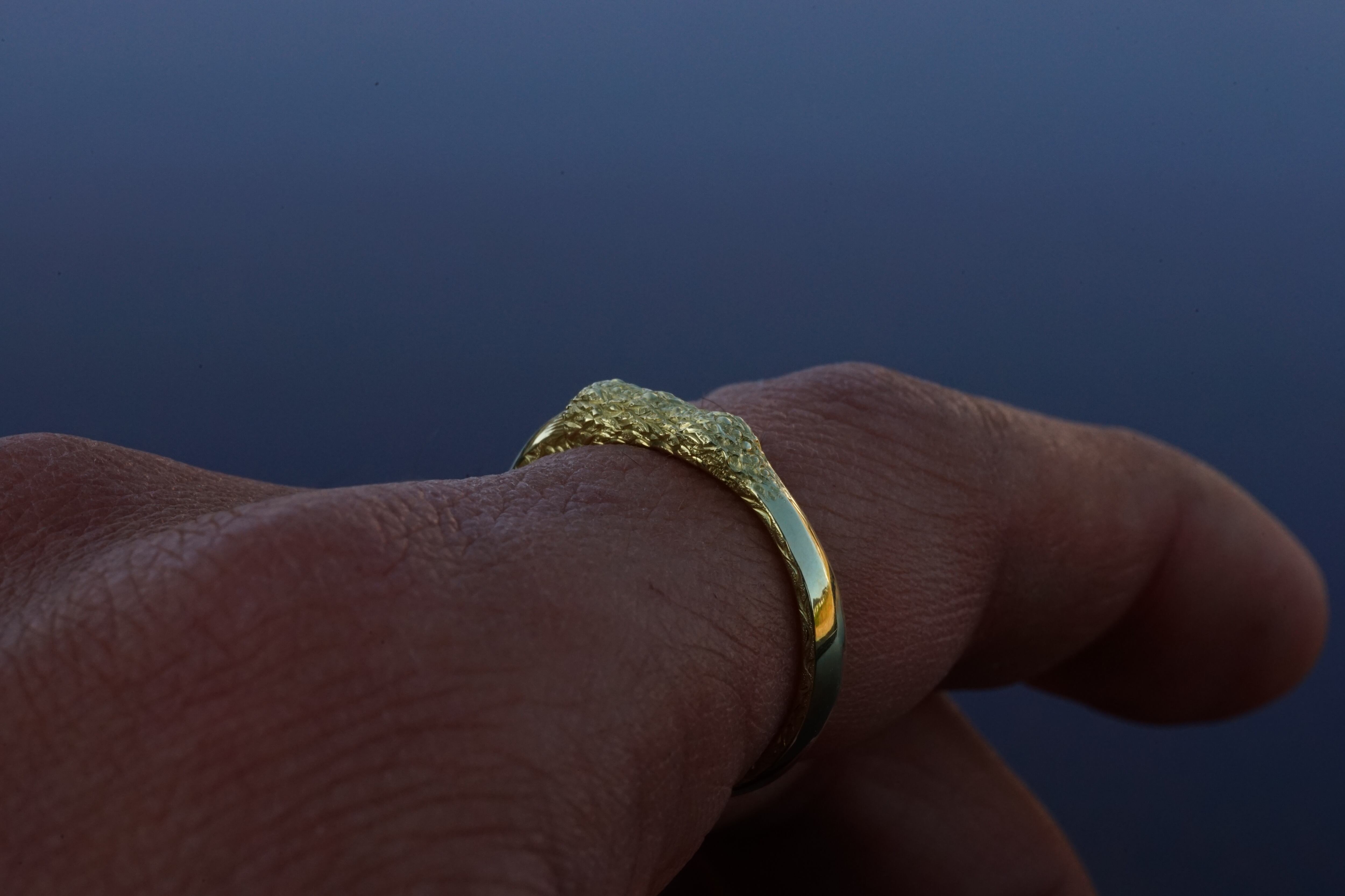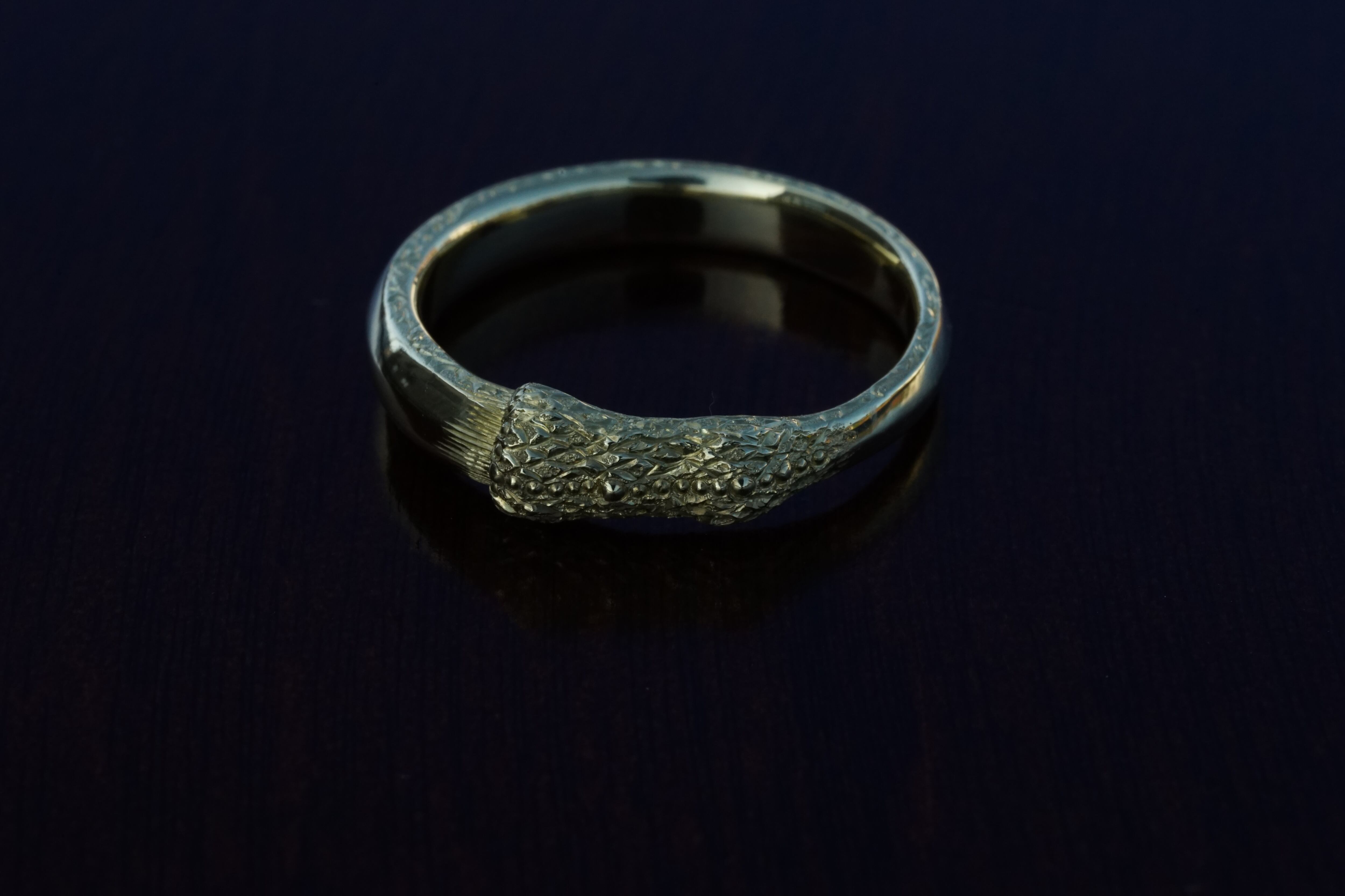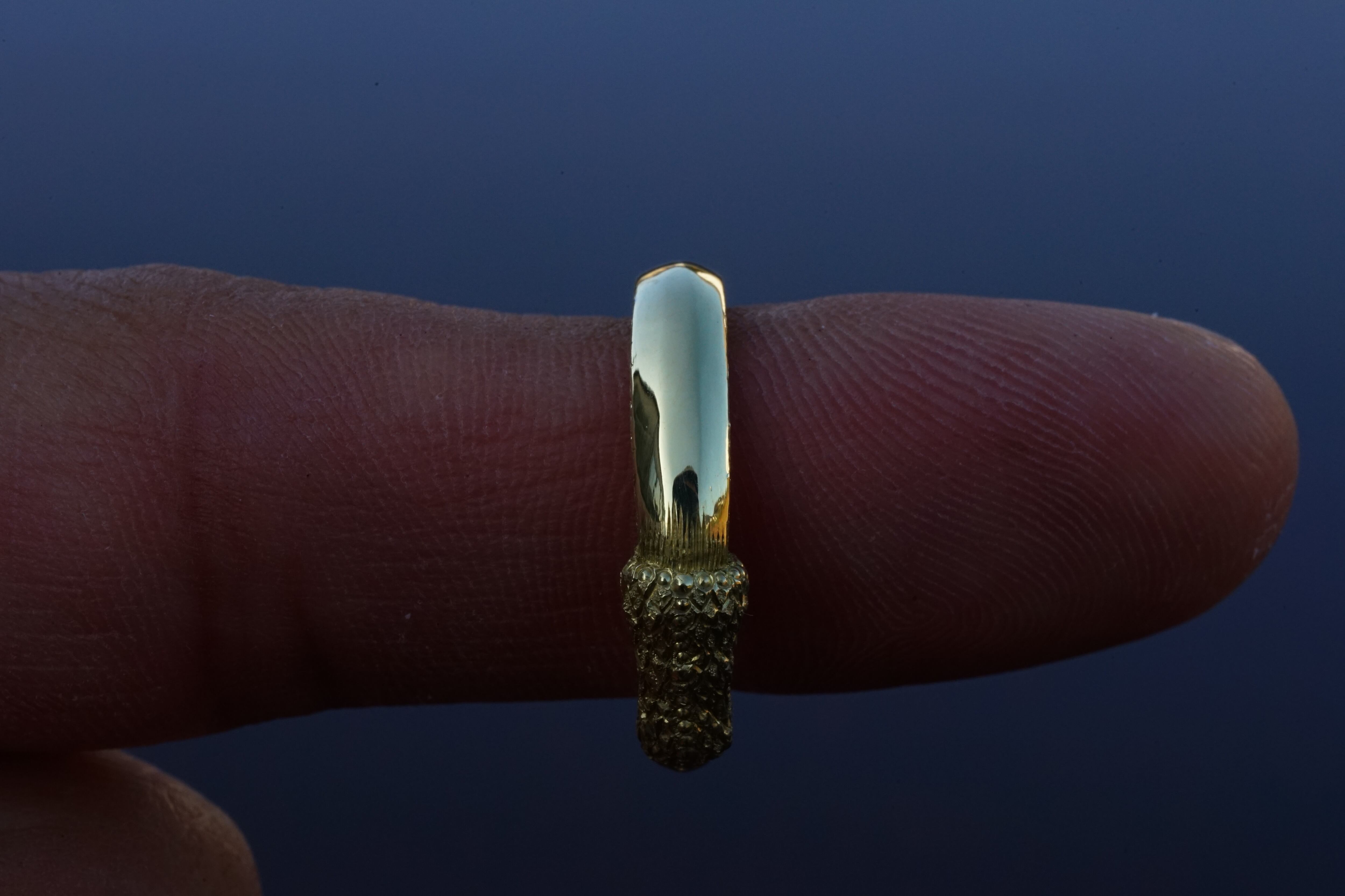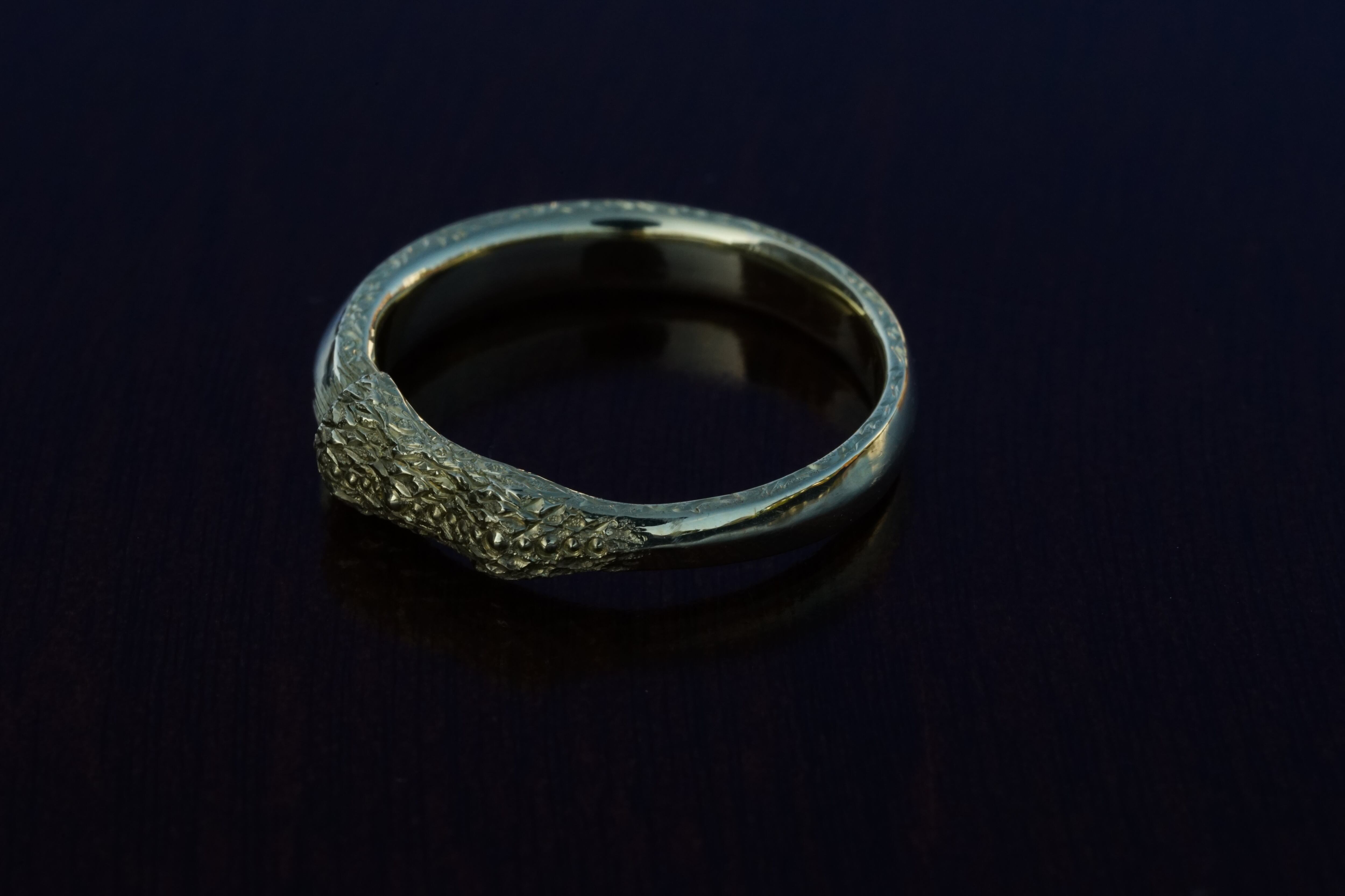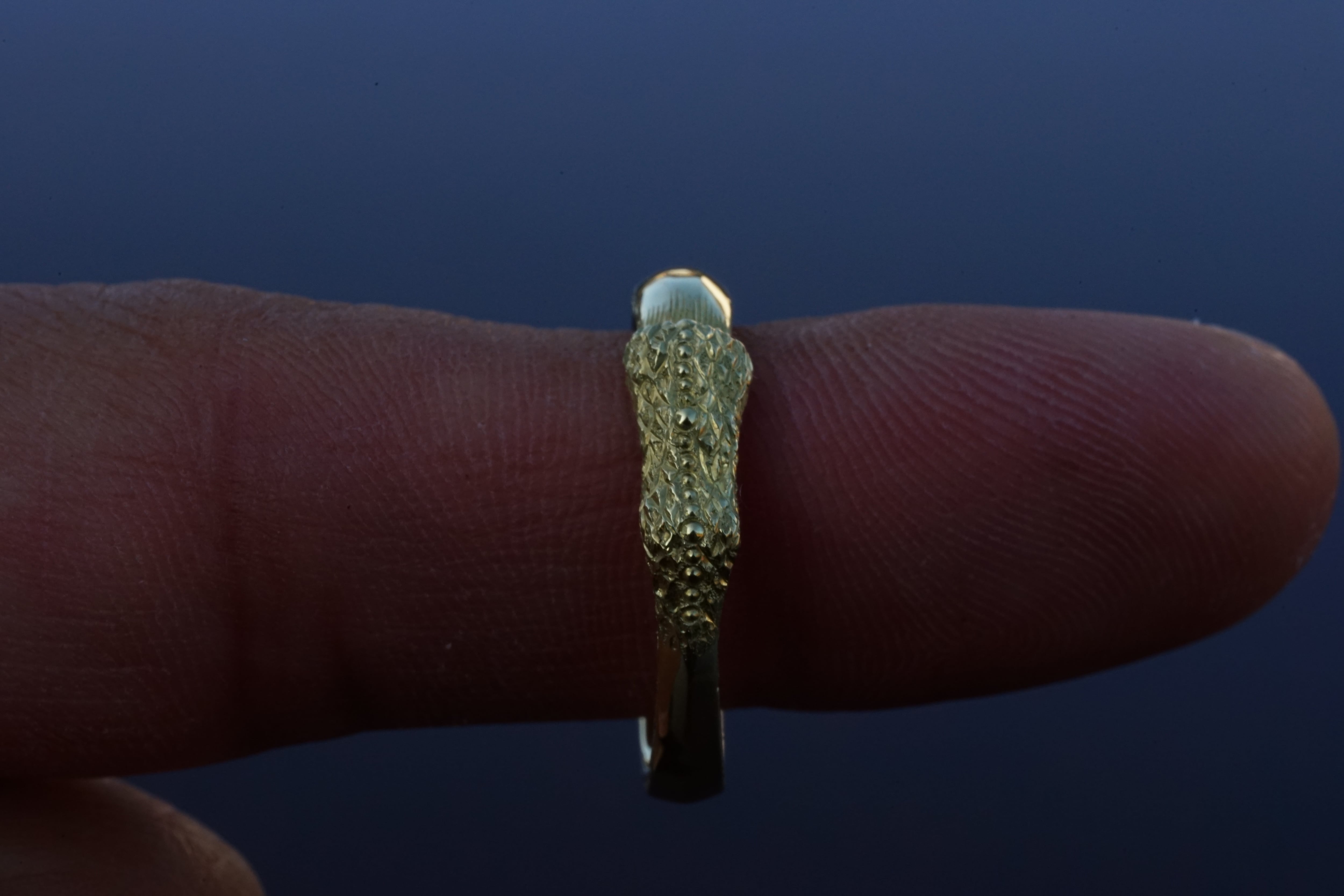 Aki Tanakaによる一本爪リングに三村紀人氏が彫刻を施した共同創作品。