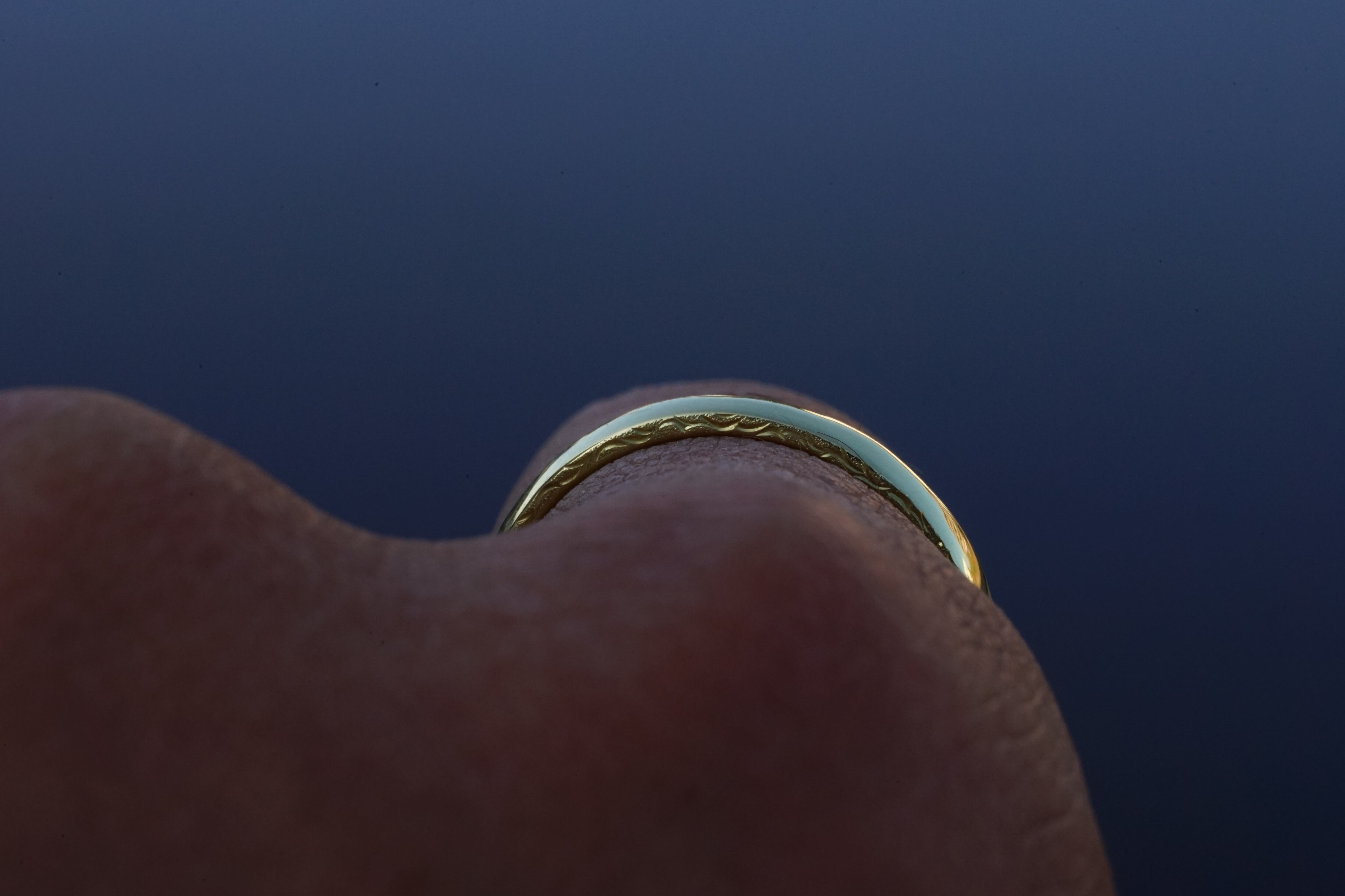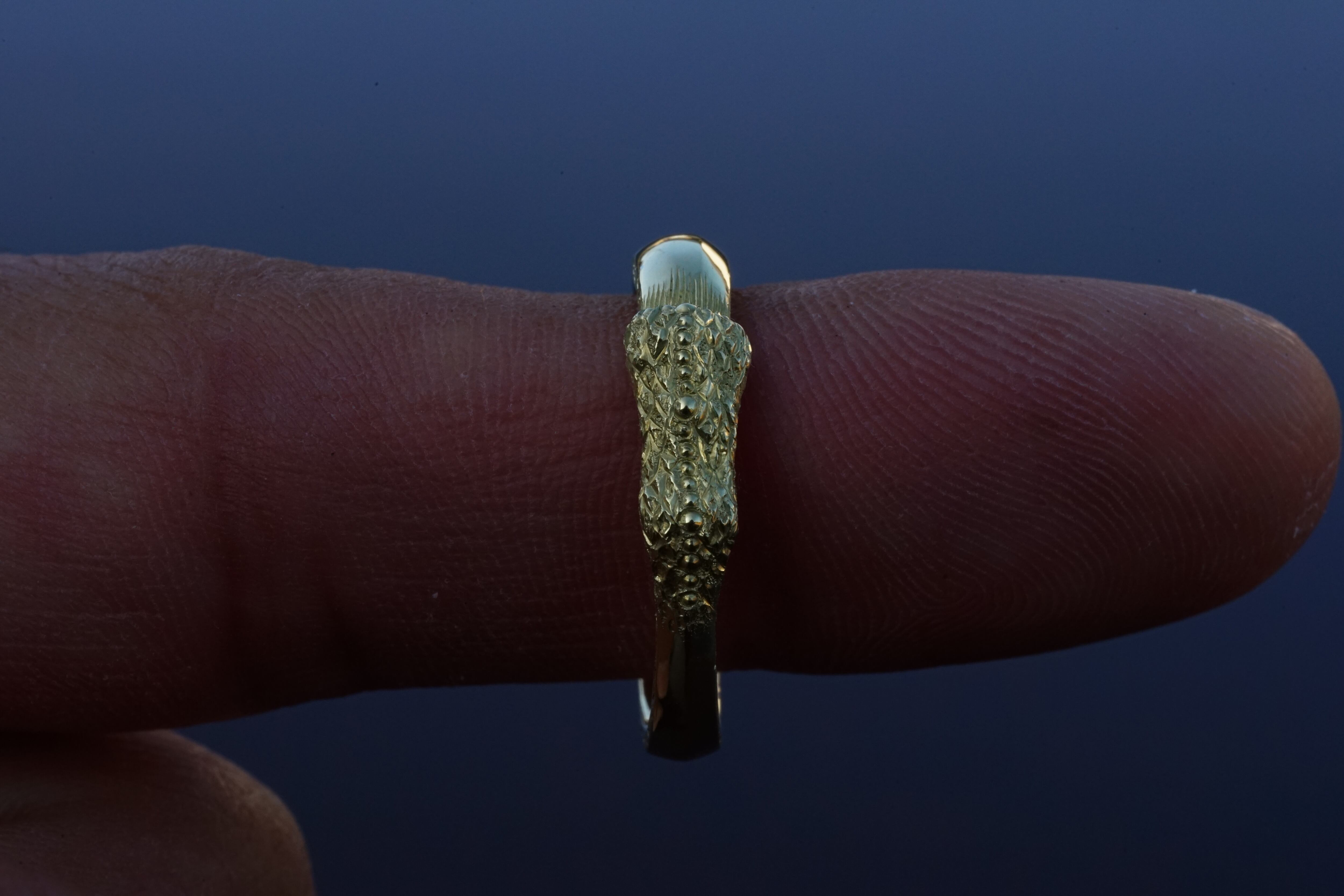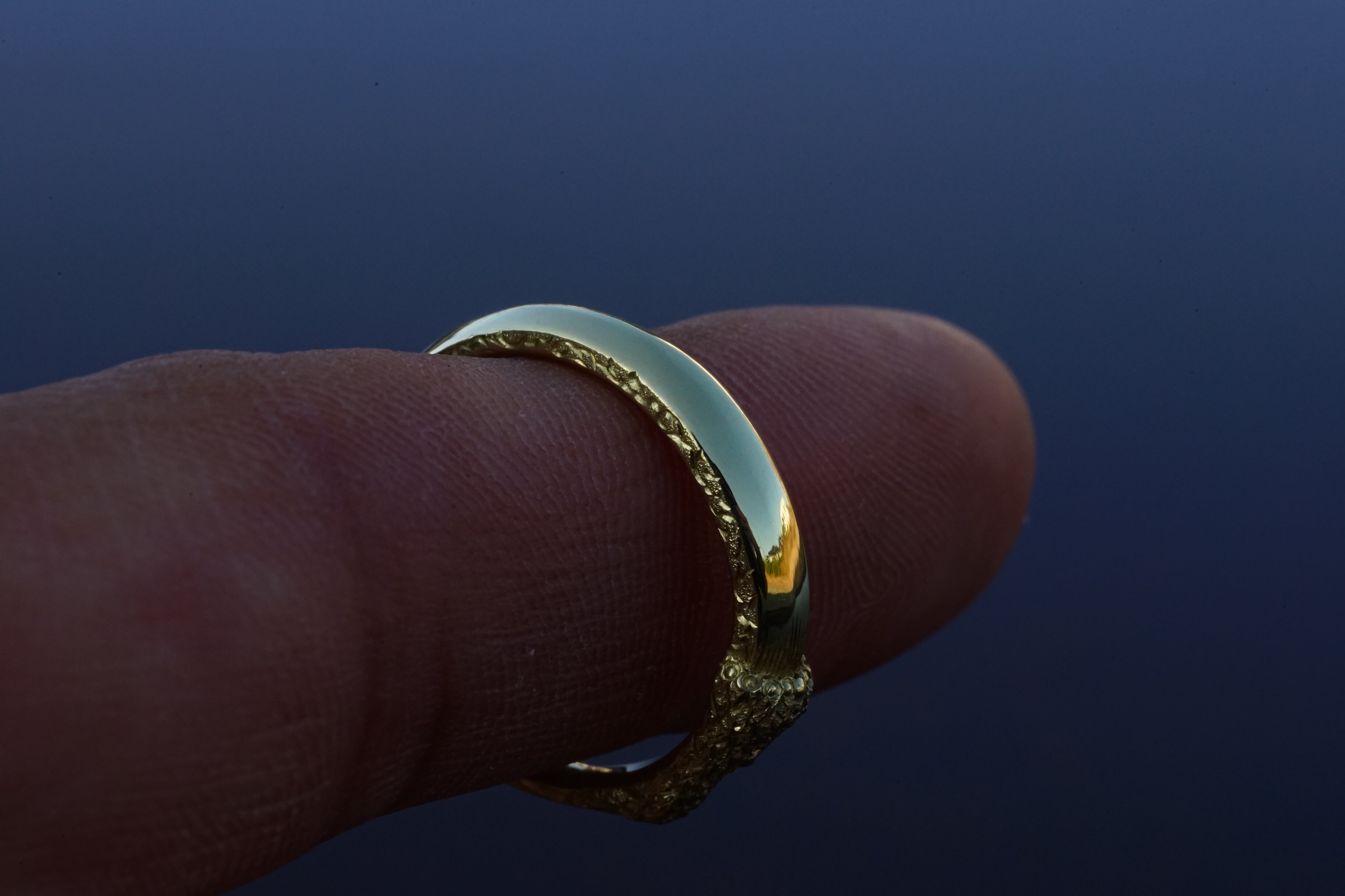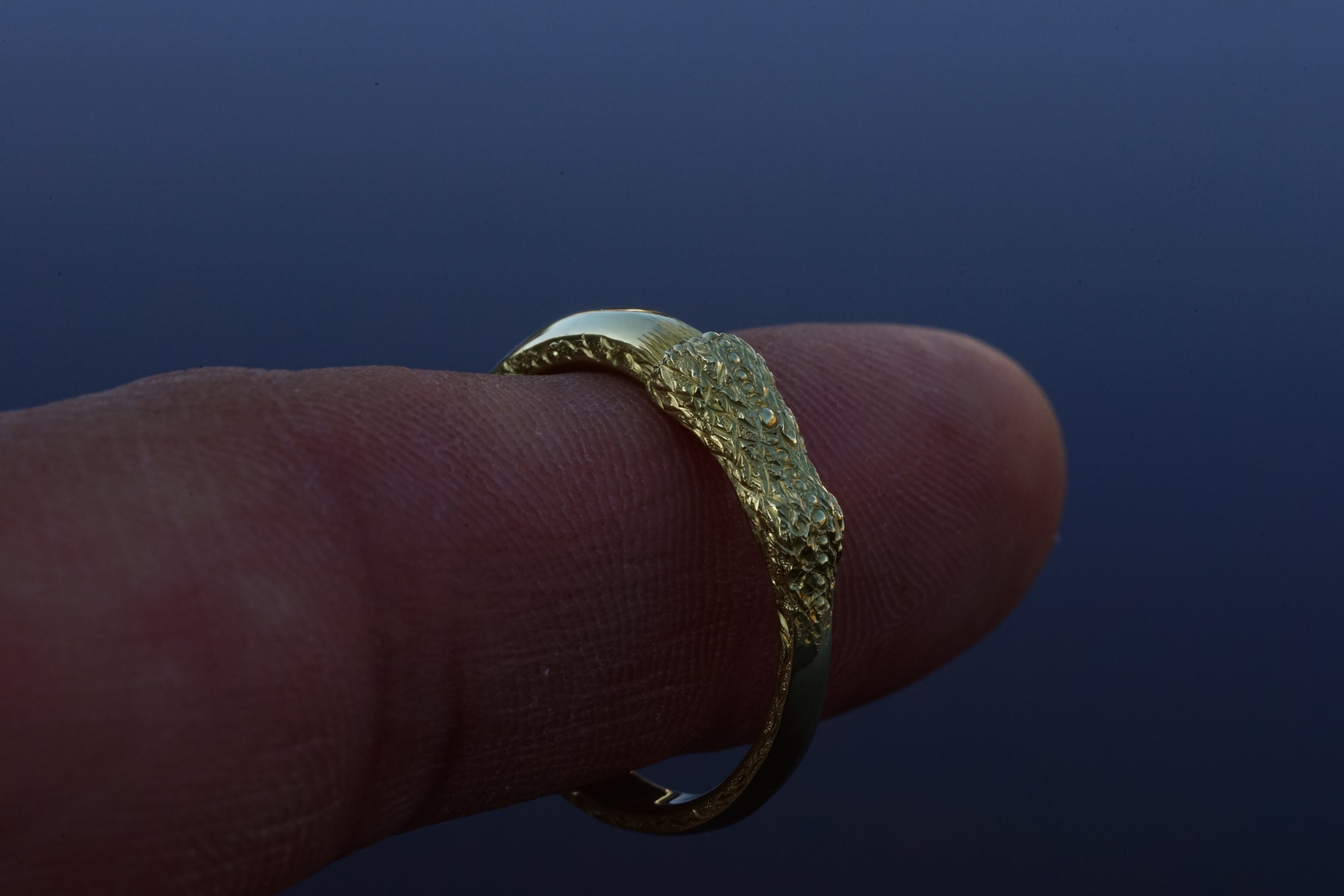 Aki Tanakaによる一本爪リングに三村紀人氏が彫刻を施した共同創作品。
